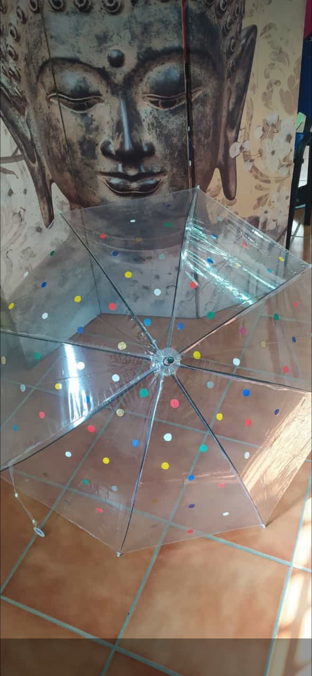 Paraguas transparente pintado a mano de lunares de colores con mango y pinta de madera